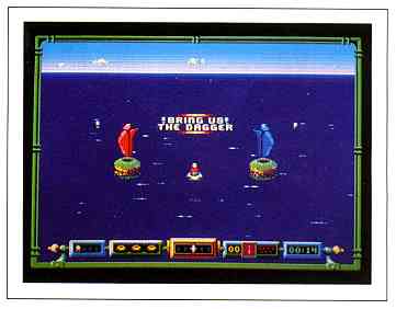 After one of three amusing opening sequences, the Spirits tell Thompson which artifact to retrieve and grant him an additional weapon to use. Now head for the Sea Sprite islands and fire at one of the pods. A direct hit brings one or more flyers from the pod, each manned by an irate Sea Sprite. When you blow up a flyer the Sea Sprite pilot will tread water briefly, at which time you'll have to grab him and stuff him in a sack. If you're too slow the Sprite will head toward a pod, skipping over the water like a flying fish (but you can still capture him if you stun him with your laser cannon).