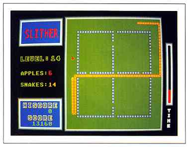 If you become bored because you can reach Level 30 in your sleep, wake up! You can load new Slither fields by pressing the 5 key at the title screen. Load the sample file FIELDS.TXT to change the playfields in levels two through five. To restore the original play fields, press the 6 key at the title screen.
