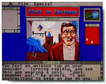 The Inventory window shows what you are carrying. Items can be picked up from the main window and dragged to the Inventory window. Items in inventory can be rearranged, a great time-saver. For example, there are some newspaper clippings in your wallet, which is in your pants. To get at them you must OPEN your pants, which shows a picture of the wallet (Whew!), then open the wallet. By dragging the clippings from the open Wallet window to the main inventory window, you save a lot of "point and click."