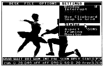 Brightness, sample and playback speed, and selected palette are software controlled. No matter what the sampling rate (delay between grabs) is set to, each capture is instantaneous. Since the image is 16-shade monochrome and the ST palette only contains seven true grey tones, a variety of color-toned palettes are included from which to choose. Users can create, save and load palettes of their choice as well. Additionally, the Vidi-ST software allows "quantizing" an image to reduce the number of shades used. This can occasionally improve the appearance of an image, but is most useful for freeing up some colors for use elsewhere in the picture (titles or what have you), or for displaying two edited vidi-pix at once with different color schemes. Taken further, the quantizing can create "poster art" type high-contrast images, which might make great backgrounds for title screens on home videos.