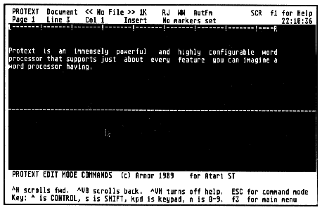 Protext is an immensely powerful and highly configurable word processor that supports just about every feature you can imagine a word processor having. It does not, however, utilize GEM, relying instead on its own command-line interpreter. Be prepared to memorize (or look up) a vast array of commands in order to make use of Protext's many features.
