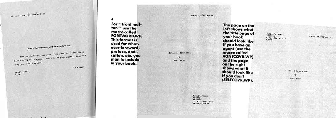 The foreword, dedication, etc. go on separate pages at the front of the manuscript. Using the dummy file "FOREWORD.WP" for this front matter replace the information in this file with your particular information, and remember that front matter has no page numbering. For the cover page, use "SELFCOVR.WP" if you don't have an agent, "AGNTCOVR.WP" if you do, replacing the information accordingly.