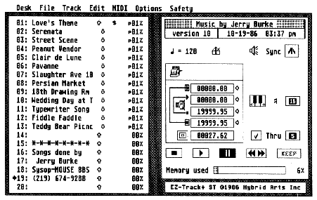 On the left side of the screen is the track information and control area. Each track can hold data from any number of MIDI channels. Either the original MIDI channels will be used for playback or the track can be explicitly assigned to play on a single MIDI channel (alterable in real time). The display shows the track name, mute on/off, protection flag, MIDI activity indicator, assigned MIDI channel and amount of memory used. During playback, individual tracks can be turned on or off at will. For faster auditioning, an individual track can be soloed (with all others muted) or bowed out (with all but that track playing). Tracks are played from start to end with no looping.