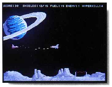 Fly your Attack Fighter with a joystick; just move it in the direction you want to fly. Press the fire button to launch a missile from the nose of your craft. If you find yourself hopelessly outnumbered, press the space bar to activate the ultimate weapon, Hyperkill. A Hyperkill will destroy all enemy fighters on the screen at that time, but try not to squander them, as you only have five. Press [Q] to quit the game or press [P] to pause it. The game continues until you're outnumbered and destroyed.
