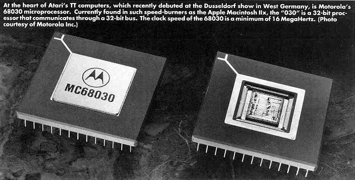 ST stands for Sixteen/Thirty-two (16/32)-the Motorola 68000 is a 32-bit processor and communicates through a 16-bit bus. Motorola's newer 68030 processor is also a 32-bit processor but it communicates through a 32-bit bus. Moreover, the clock speed of the 68030 is a minimum of 16 MegaHertz. And the 68030 is at the heart of Atari's new TT computers, a prototype of which was shown at the Dusseldorf computer show last August.