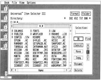 The Universal Item Selector is probably one of the most utilized products ever developed for the ST. It is an invaluable substitute for the inadequate file selector native to the ST's operating system. Not only is UIS easier to use, it increases the functionality of the machine. UIS III gives you more and I wouldn't be without it.