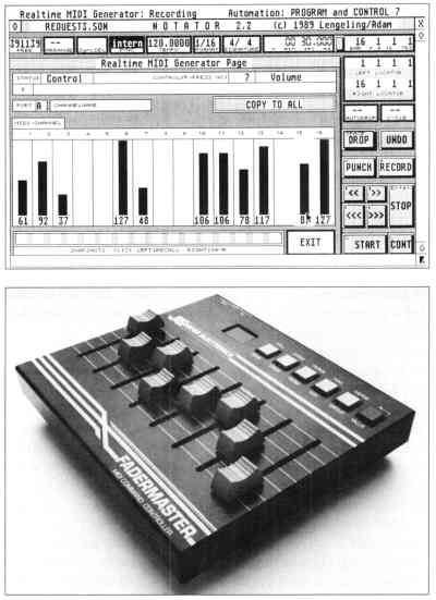 Different sequencers afford different degrees of editing sophistication. The MIDI-Track ST series provides control of a single MIDI channel at a time. You can choose or change the editing channel at will and, while replaying your sequenced song, move the screen fader with the mouse to change the volume. Cubase lets you do this with up to eight real-time screen faders; you get the full 16 MIDI channels with Crcator/Notator.