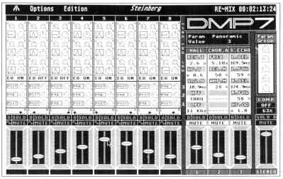 For facile operation, Steinberg/Jones has teamed up with Yamaha Europe to release the Desktop Mixing DMP7 software package. It controls up to four I)MP7s at a time, with full graphic control of mixer functions and cue-list event triggering (optional SMPTE sync via the SMP-24 interface). Advanced functions let you perform audio-processing tricks such as ganging parameters across different channels to respond to a single group fader.