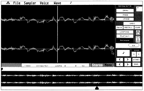 GenWave accepts up to eight samples at a time; however, long samples requiring significant amounts of memory cause the software to restrict you to fewer buffers. Only one sample (mono or stereo) may be viewed at a time on screen. An Undo Enable option automatically backs up the active buffer into the eighth buffer so GenWavc can undo most, but not all, voice-edit operations. Since these operations usually involve serious number crunching with thousands of changes in sample-file data, being able to restore data without incurring disk-access time is a big plus. If you are editing long samples that use a major part of RAM, you can disable the Undo Enable feature and back up your voice to disk.