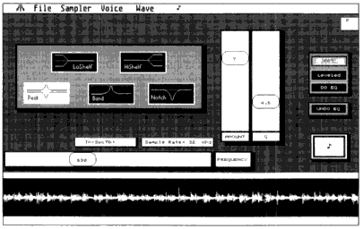The EQ Page of GenWave has a cornucopia of options. Five types of EQ response are offered: high and low shelf with a 12dB per octave cutoff, bandpass and notch responses with variable banwidth, and peak response with cut/boost and bandwidth controls. You can select a corner frequency for each response and a wide range of bandwidth choices. The FFT module is handy here; knowing the frequency content of a sound lets you make best use of digital EQ. While adding to the computation time (EQ operadons take about twenty seconds per one second of sample), lowering the amplitude of your sample with the leveling function helps eliminate possible clipping of a sound caused by boosting frequencies.