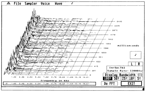 The clipboard buffer on this page is the only part of the program which requires disk access. A sample segment, specified by the start and end points, can be copied to the clipboard. Then the fun begins. You can insert the section into a different location in the sample, replacing the former contents or pushing the data back, or you can mix the two signals together in equal amounts, or you can overwrite the whole buffer with the clipboard data. You can hear your edits with the note button, and GenWave will perform a harmonic analysis of the sound with the FFT module, activated at the push of another button. This module displays a nifty 3D graph of amplitude versus frequency versus time. A shortcoming here is that the display is static; you cannot reorient its time axis. Sometimes this can cause large attack transients to obscure subsequent harmonic activity.