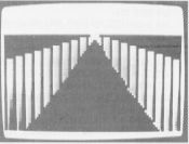 In order to protect your home base from the dreaded Death Star, you are launched in your X-wing fighter to attack the enemy. As the simulation begins, you are flying "down the trench," the walls of the trench whipping past. The object: destroy the five radiation ports from the Death Star's main reactor. If you succeed, the reactor will overheat and self-destruct, destroying the Death Star. To hit the radiation ports, line up your cursor aiming system, using joystick (0), and fire, using the red button. The ports are oval green openings in the bottom of the trench. The Death Star has a full complement of Tie fighters for its defense. The fighters attack one by one, firing furiously. If you are hit too many times, your fighter will explode and crash. To combat the Tie fighters, you'll have to wait till the Tie fighter is in the center of the screen before you can hit it. If you don't want to type in this program, send a stamped self-addressed envelope and cassette with $4.00 to David Plotkin.