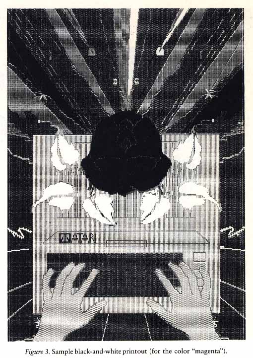 This effort begins to seem much more worthwhile when you consider that our finished picture, created on a dot-matrix printer that retails for about $400.00, produced a commercially-printed color picture with better dot fidelity than that provided by Seiko's new 150-dot-per-inch thermal-transfer printer ($8950.00) or a standard ink-jet printer (approximately $600.00). No matter how fine a four-color computer printer is, artwork produced on it must be rescreened by the color seperator to be made ready for commercial printing. This Atari artwork, however, did not need to be rescreened.