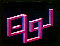 My Escher Sketcher is an isometric sketch pad that uses the joystick to draw boxes and lines in isometric view. M7hen the joystick is moved in the typical four directions, cubes will be drawn on a two-dimensional plane. When the fire button is pressed, the joystick stacks cubes above or below the main plane, giving an illusion of depth. A variety of colors for the blocks are possible, and a "line" mode is included to embellish your designs.