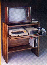 Organization is made easy by the CS 1632 computer storage cabinet. You can store a computer, monitor, controllers, software, books and peripherals in this compact, functional unit. The built-in, slide-out shelf is set at standard typing height for comfortable use of the ATARI computers. When the computer is not in operation, the fold-up locking door protects it from accidents, pollutants and undesired handling. Controllers slide upside down into the inverted storage rack. The back center panel contains twist tabs (which neatly bind together and conceal wires), as well as a shelf for unsightly transformers. A slide-out software tray accomodates up to 14 cassettes or cartridges, and 30 diskettes. The dimensions of the cabinet are 36" high x 34" wide x 16" deep. Tools necessary for assembly are a screwdriver and hammer. Tile cabinet is made of simulated woodgrain. State your preference for the finish: golden oak or natural walnut. $89.95 includes shipping fee.