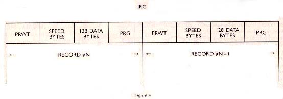 The "inter-record gap" (IRG) between records is actually the sum of the two gaps (see Figure 4). Every record is preceded by a "pre-record write tone" (PRWT) and is followed by a "post-record gap" (PRG). When the records are linked into a file, the resulting IRG equals the sum of the PRWT and the PRG.