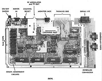 The eight chips that line the left side are "64K by one-bit" RAM chips. In the front left corner is the color-adjustment circuit. Above the GTIA and to the right of the RAM chips are the dynamic-RAM address multiplexors. Further up is the master clock. The intervening gap is reserved for the circuits needed by the XLs prepared for international markets.