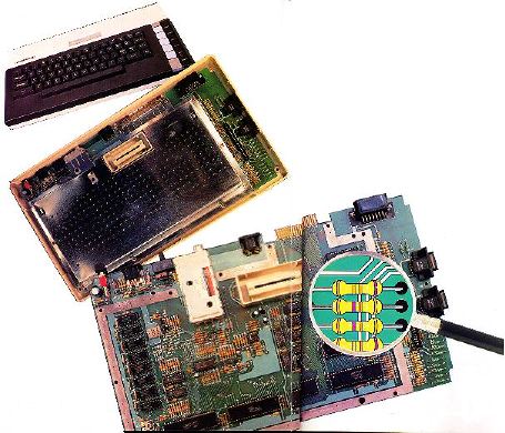 The metal plate that covers most of the printed-circuit (PC) board suppresses radio-frequency (RF) interference. The exposed arrays of resistors and condensers at the immediate right of the plate also serve that function. The controller ports are mounted at the extreme right, and the serial 1/0 plug is at the upper right.