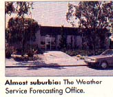 It looks like a suburban house until you see the 24-foot satellite dish antenna on the roof. This is the National Weather Service Forecasting Office, just off the freeway in Redwood City, California. Inside this unassuming building, an astonishing array of computers and electronic equipment helps meteorologists make weather forecasts for the Western United States, local TV stations and ships at sea.