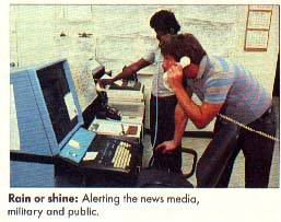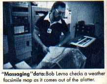 IBM microcomputers monitor the stations, deciphering hydrologic data, wind speed, air pressure and temperature. This information is then sent to repeaters. In yet another room, meteorologists record weather news reports to be broadcast over the local shortwave weather band.