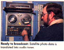 The information is stored on tape and an entire day's worth of satellite pictures are sent at once. The computer transmits the signal over telephone lines to a transmitter at the Coast Guard station in Point Reyes, a coastal town 75 miles north of Redwood City. WEFAX maps from this station are identified by the letters NMC across the top.