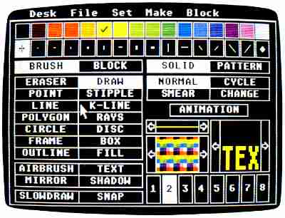 The menu screen in DEGAS Elite has something the original DEGAS didn't have-a real GEM menu. Across the top of the screen you'll find the selections Desk, File, Set, Make, and Block. Below the menu is a bar showing available colors for the resolution you're working in. On the left of the screen are command boxes and the right side of the screen shows the current fill pattern, line style, and text shape. Eight numbered boxes along the bottom indicate the current work screen in use.
