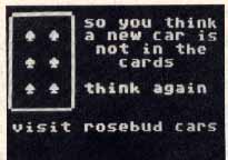 Select items from the menu using either keyboard or joystick. The menu pointer can be moved with a joystick or the arrow keys. Press [RETURN] or the joystick button to select an item marked by the pointer. On most menus an item can also be selected by pressing its first character on the keyboard.