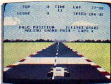 Pole Position ($19.95) is my favorite 8-bit game of all time. It's true to the original coin-op, lacking only some voice synthesis and billboard advertisements. Playability, graphics and sound effects are all superb. You must weave in and out of a pack of cars to qualify for the big race, passing at least one along the way. If you pass them all, you can get Pole Position. From there, the race is on.