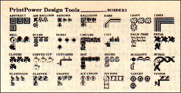 All artwork can include a border and one graphic design per layout page. This means you can have graphics and text on all faces of a card. The graphic can be copied and pasted at will over the layout page using the arrow keys for freehand positioning. Five graphic sizes can be used, ranging from one inch to full page. Borders, if included, can be one inch or a half inch wide.