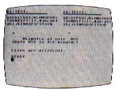 Each window shows a 256-byte block of the file. The left window corresponds to the first file, the right window shows the second file. Each window is approximately 19 characters wide and 14 characters tall. Any [RETURN] symbols will make the window taller. If your file has an abundance of [RETURN]s, the tops of your error windows may scroll off the top of the screen.