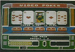 The graphics for Video Poker are good, as are the sound effects. Unfortunately, the interface is clumsy and uses widely separated keys. The joystick would have made a superior control mechanism, even simulating the pulling action of a real slot machine.