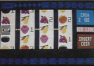 Place as many as five coins in the slot by pressing the [RETURN] key, then press the [SPACEBAR] to draw a five-card poker hand. The cards are displayed across the top of a simulated slot machine.