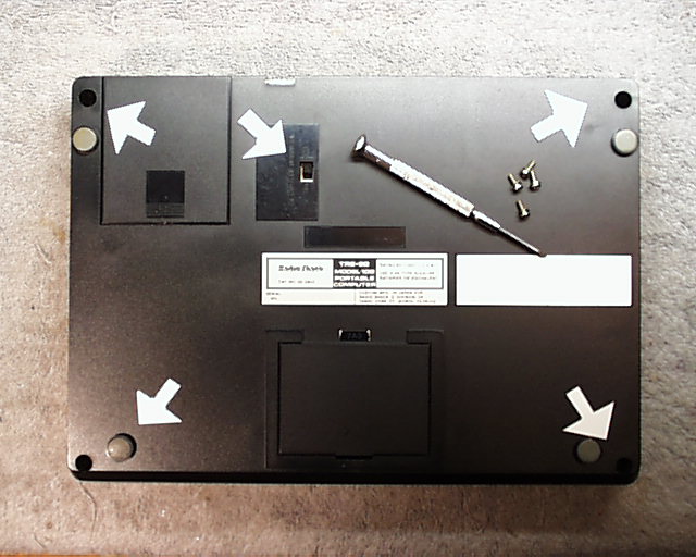 To get to the RAM area of the Model 100, you must split the case. Start by turning the unit over. Next, turn off the MEMORY POWER switch (see middle arrow) and remove the four case screws. Set these particular screws aside as they are different than most of the screws on the inside of the machine, although you will not have to remove more screws to add RAM modules.