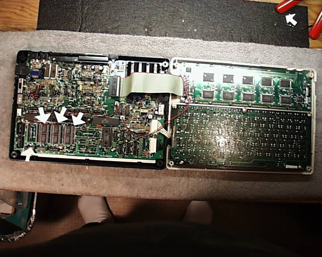 With the case laid open on the famous Club 100 work bench (complete with towel), let's identify the RAM area. You will note three arrows pointing to RAM modules and one (albeit a bit hard to see) pointing to an empty socket. You are looking at a 24K Model 100. From right to left we have 8K, and them another 8K making it 16K, and them another 8K making it 24K. This particular motherboard was manufactured as a 24K unit but you will find 8K and 16K units in the field. And, believe it or not, there are some 32K units. These were the last Model 100's built. And then came the Model 102, but that's yet another story yet to be told.