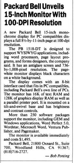 This monitor displays monochrome (black and white) picture in portrait align, making the screen look like a sheet of paper. It makes text editing in WYSIWYG applications easier. To support this, a non-standard graphics card, made by Genius, was needed. There are 2 known cards, one for PC (8-bit ISA) and one for Atari (but which?).