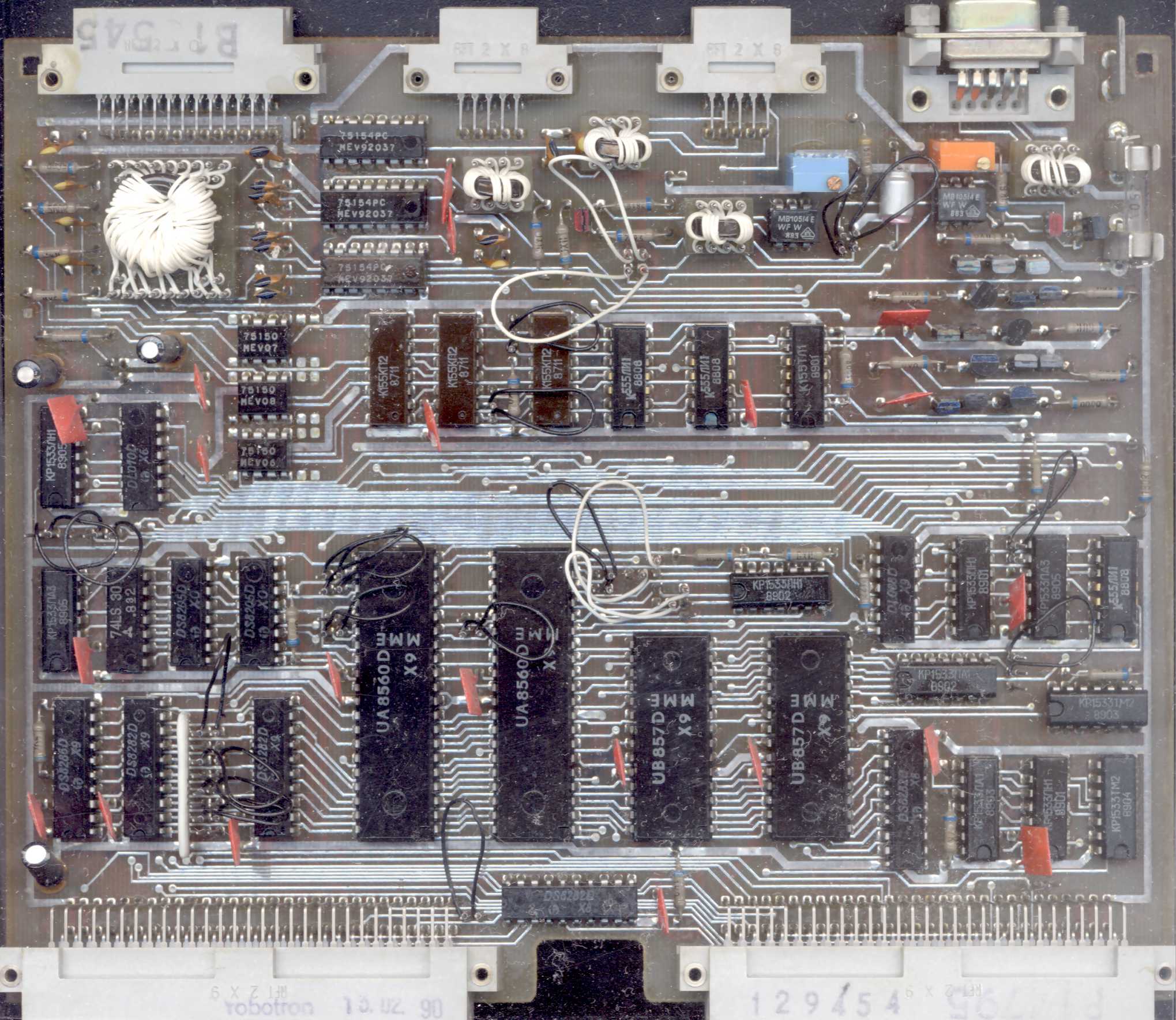 My unit is a late one with serial number 9999, manufactured in 1990. Most parts are German or western, although few Soviet chips are present. I don't have keyboard for it (the K7672, like for A7100/7150). It looks like some of 16 RAM chips require replacing as it displays "RAM F" message, in which "F" seems to be for "Fault" or "Fehler".