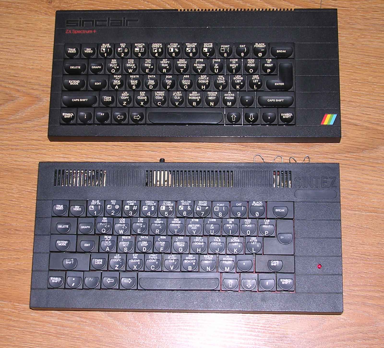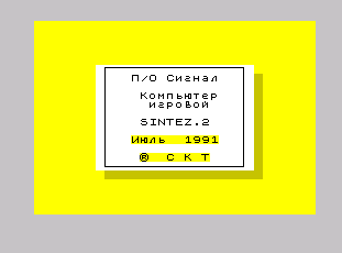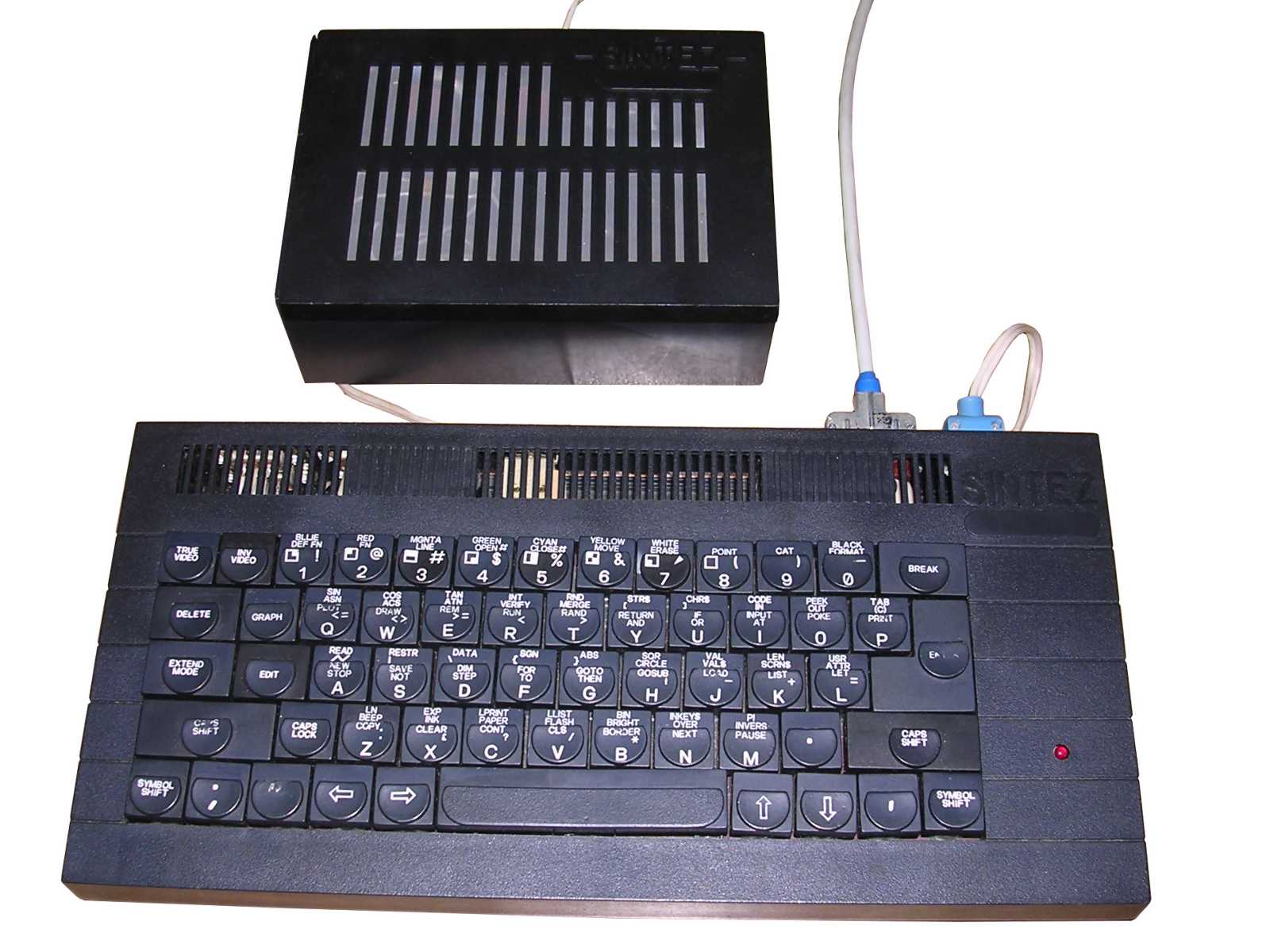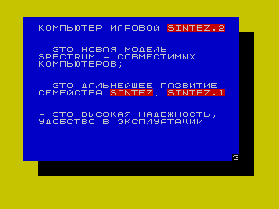 so common outside former Soviet Union countries. Sintez 2, contrary to ZX Spectrum, has no ULA chip, but it's built entirely on TTL logic chips. Single-voltage DRAM chips are powered from 5V, fed directly from regulated power supply. There is also no RF modulator inside, only RGB output to connect by e.g. SCART to a TV. As a gaming machine, Sintez has joystickports for typical joysticks and one Kempston one. Near 1991, Mezon plant (also in Chisinau), started to make small quantities of Sintez 3. They were based on proprietary chip and had possibility to bump RAM to 128kB. |