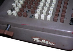 This is a Chinese more-or-less clone of Monroe L-series calculator, the one from 1940s, although some sources (compvter.it, 2018) claim that it was a license copy (at least under name "Shanghai Calculator JSY-20"), there are too many modifications to the original so it's most likely a clone. These mechanical differences include a clock-like chassis instead of frame-like, orientation of relase plate, bell mechanism, but generally the principle, appearance and operation is the same. I have no idea how old my unit is, but I can estimate it. In some websites we can read that this machine was manufactured in 1950s, while in other that even in late 1970s. It is also known that there were a few versions - gray with black keys was probably a late version, brown with dark-brown, a bit matte keys made of some plastic, but my unit is brown with brown, shiny keys. Additionally gears and levers are machined, not sheet-cut which excludes 1970s, as mass production then was developed enough to quickly cut many parts of mechanism from metal sheet. The material used for plastic finishes was a puzzle to me, but by some experiments I found that in my unit it is a celluloid. So definitely 1950s, maybe early 1960s from surplus. Celluloid was one of the first plastic materials, but is not very good as a general-purpose material: it is extremely flammable, it cracks when exposed to light and releases gasses when exposed to temperature, so as better polymers became invented in 1950s and 60s, it was used less and less frequently.