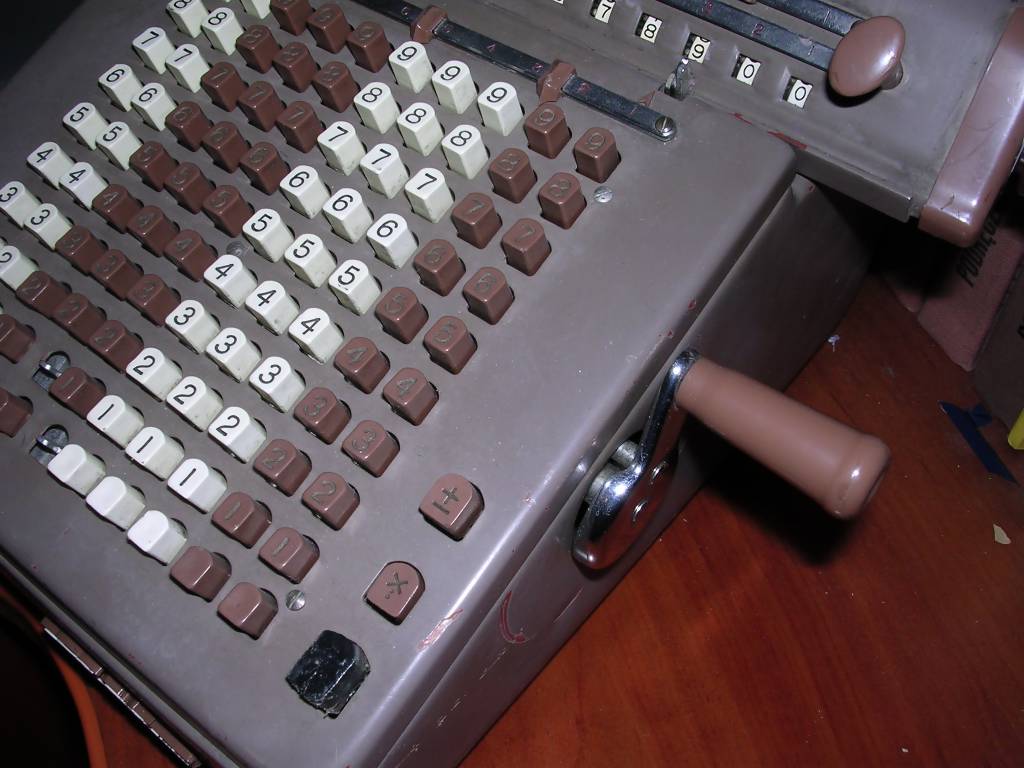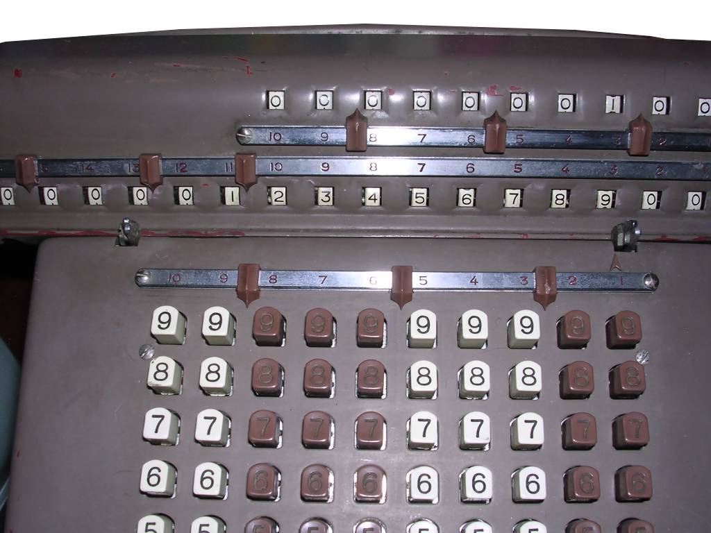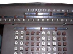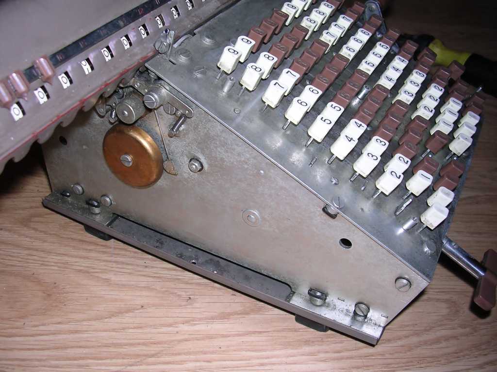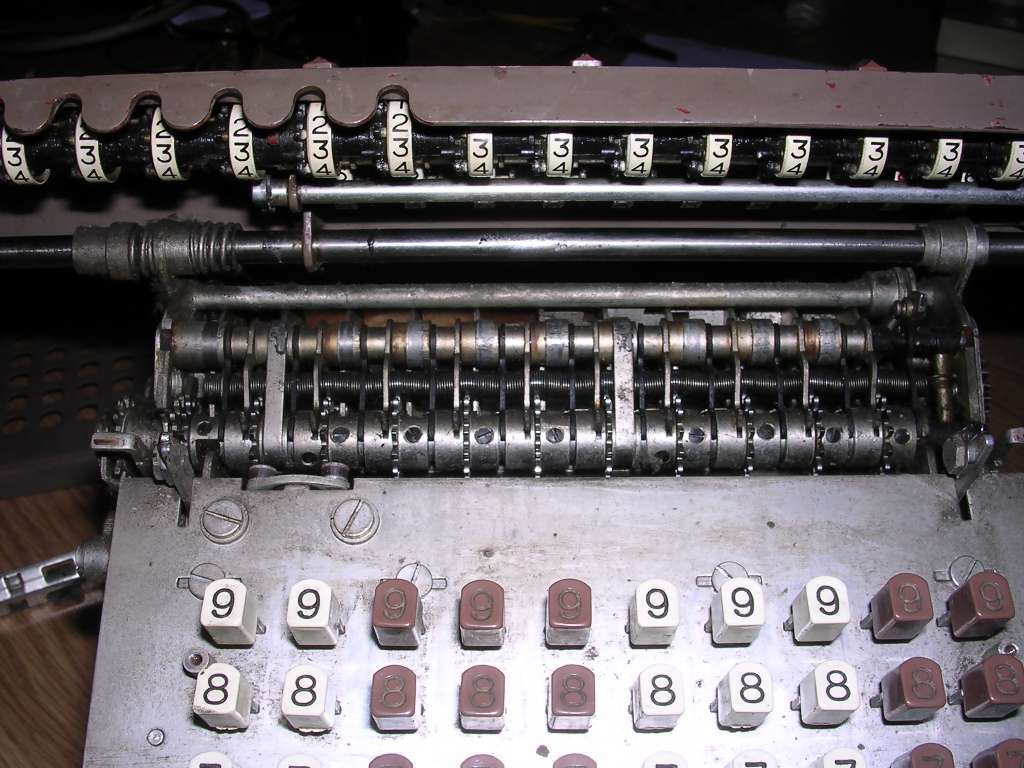 The mechanical principle of operation is simple: When you press a key, a lever is pressed in its specific place. This place has a protrusion bent in angle specific to digit. So, when you press a key, the lever moves a distance specific to the value, there are about 5 distances per lever, for one digit one lever moves to the left, another one moves to the right, so there are 9 levers positions like 9 digits per one 0-9 "key set". These levers shift specific gears, which have teeth of different length in their cylindrical length, as a result, forming a gear with specific number of teeth. By turning crank, these gears transmit their value into upper counters.