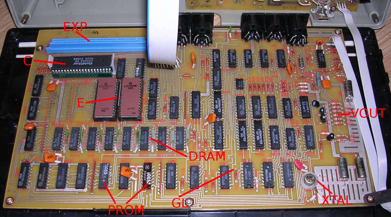 - E - two EPROM chips storing relatively large amount of data (27256 and 2764 chips). Probably programming language or operating system. Probably 2764 contains character data.