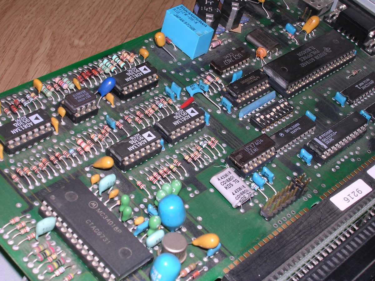 Notice old green capacitor and transistors in metal cans. This card has