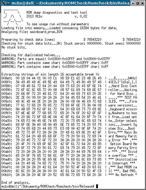 [20140328] These are small tools I've written to help dealing with ROM dumps/images of any kind. - ROMCheck - Checks ROM image for: > Stuck zeros/ones- bad data lines > Duplicated halves, duplicated parts - bad address lines > Chunks full of the same characters / patterns. > Strings/literals in files - dumps them as hex editor. Can print only strings of specified minimal length with allowed non-literal "exceptions" of custom length. It prints the information on console as a report. - hexcat - displays file like HEX editor does. - interlace/deinterlace - interlaces/deinterlaces ROM files to use in EVEN/ODD set-up. - roundTo - Fills ROM image with speicfied content to soecified size (as number, nearest multiply, nearest power). All these programs work from command line usingparameters. Run a program without parameters to get information about usage.