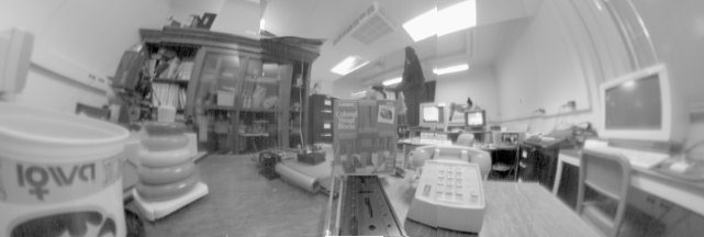 Computer vision research at the University of Iowa Computer Science Department is primarily carried out by Margaret Fleck and her students. Our laboratory, which we share with the simulation group and occasional course projects, contains two PUMA robot arms, seven cameras (five color), and all sorts of interesting equipment for computer vision experimentation. The lab is quite crowded but we can make it seem spacious in this picture using wide-angle photography: