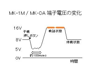 子機の「押しボタン」“押し”で、約100msec間、端子電圧は約4〜5V近くに下がった後、これを親機が感知すると、本格的に起動するらしい。