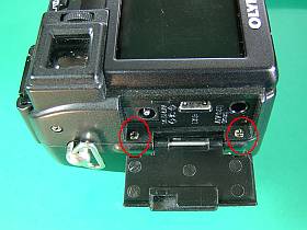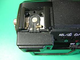 分解の初っ端で躓いたのが、「外部フラッシュ用ホットシュー部」の念の入ったビス留め。先のC-760には無かった構造で、実はここを完全に外してしまわないと、後ろカバーが開けられないのです。
