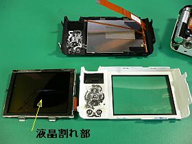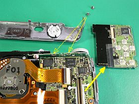 液晶ユニットは、(通常のデジカメのような“両面テープ留め”とは違って、)金属フックで留めるようになっていて、手前/下部を抉じて持ち上げれば、すんなりと外せました。(この構造は、なかなかいいですね!左写真<クリック>)