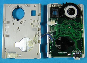 再度中を開けて、今度は電池接続端子に直接リード線を半田付けしました。(左写真。尚、クリックで最初にばらした時の写真が出ます。赤丸印は爪の箇所で、特に閉める際にこれらの扱いには、コツが必要でした)