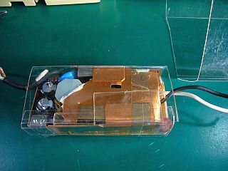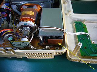 そこで、別のACアダプタを買って来て、その内部モジュールだけを、内蔵電源部を取り払った跡に組み込んでみた。(失敗例のひとつ)