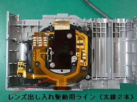 これは、左写真のモータ駆動ラインのフレキ端子から、3Vを直接印加(左側+、右側−で引っ込み、逆で、押し出しだっけ?)したら、レンズを収納出来ました。