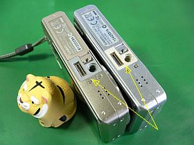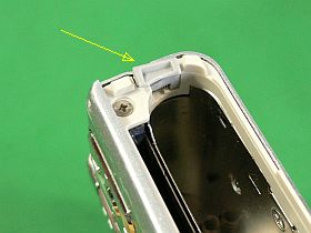 正常動作品の方は、“バッテリ押え爪”がグラグラで、“裏蓋/底板”を開けて不用意にSDメディアを取り出そうとすると、バッテリが飛び出して来ます。多分、これがジャンクになった理由か?(左写真&<クリック>)